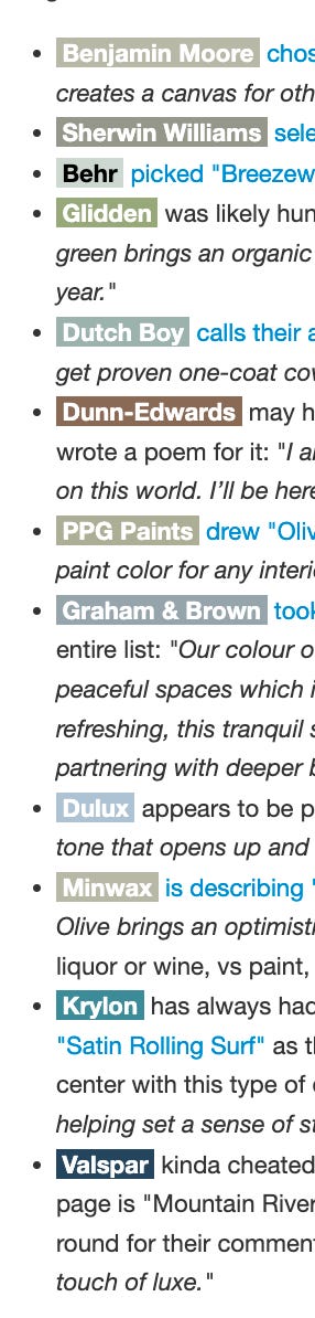 I’m a little sad about the Substack platform’s minimalist approach to publishing. I 💙 constraints, but I failed to test what I had composed in my markdown editor before posting the rendered story in here and it made all my efforts to color each paint company name with their chosen color of the year for naught: