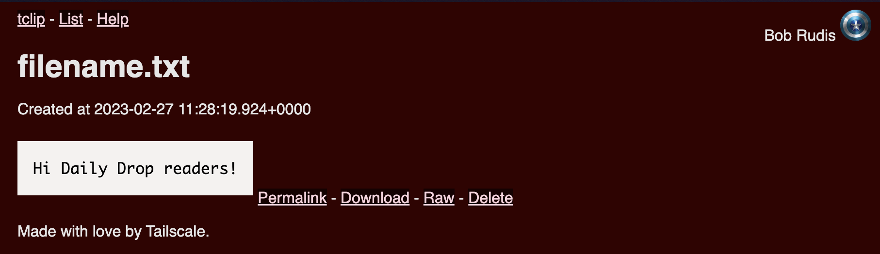 We at the Drop 💙 Tailscale, and the Tailscale community recently released tclip — a “pastebin for tailscale users”.