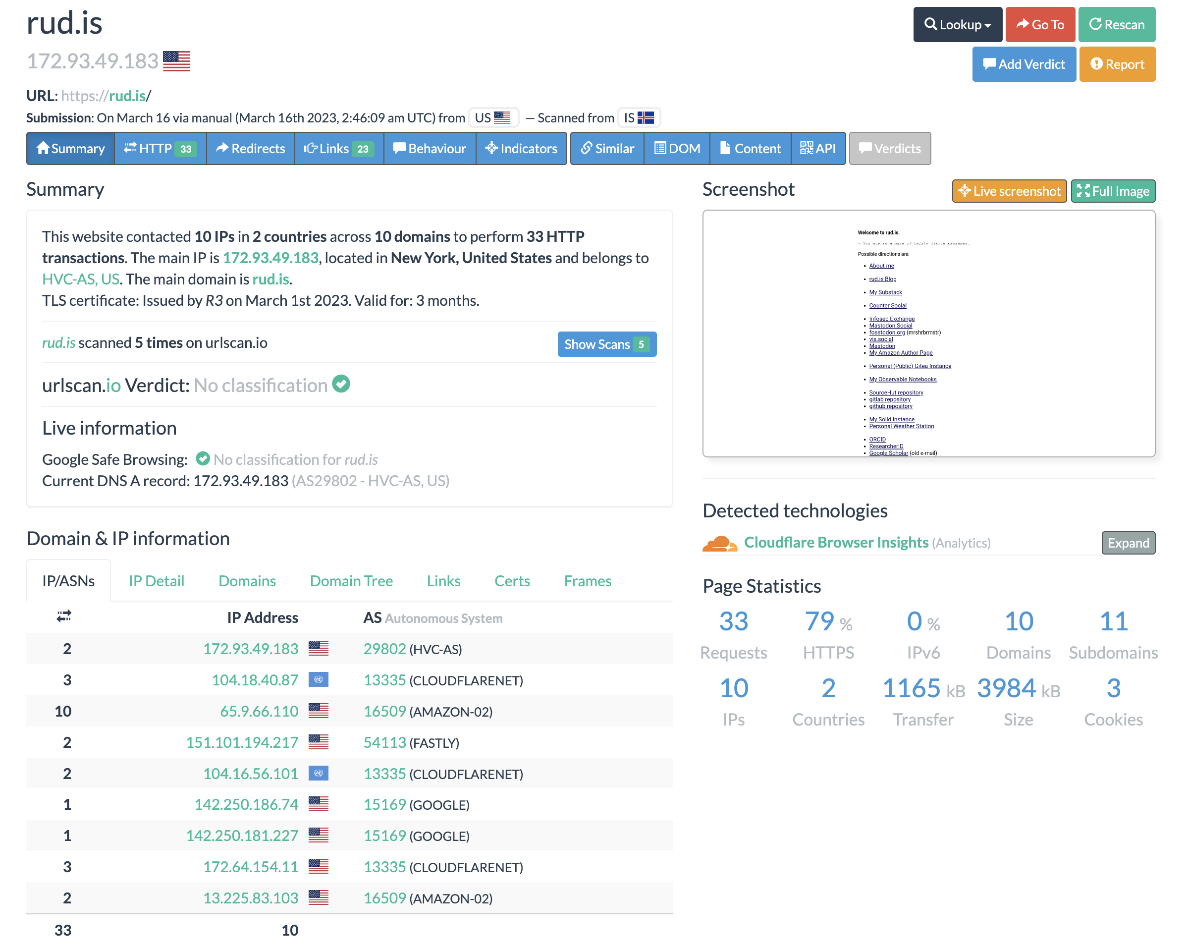 Urlscan.io is a free service for scanning and analyzing websites, helping users identify potentially malicious activity. When a URL is submitted, the platform browses the site like a regular user, recording various details such as domains, IPs, resources, and more. Urlscan.io also captures a screenshot, DOM content, JavaScript variables, and cookies. If the site targets users of over 900 monitored brands, it’s flagged as potentially harmful. While the core service is free, commercial options are available for heavy users and organizations. Urlscan.io aims to make it easy for anyone to confidently analyze unknown or suspicious websites, providing valuable context to help users understand potential risks. Oh, it also has an API, and if you hunt around on my GitHub, you’ll find an API wrapper for it in R.