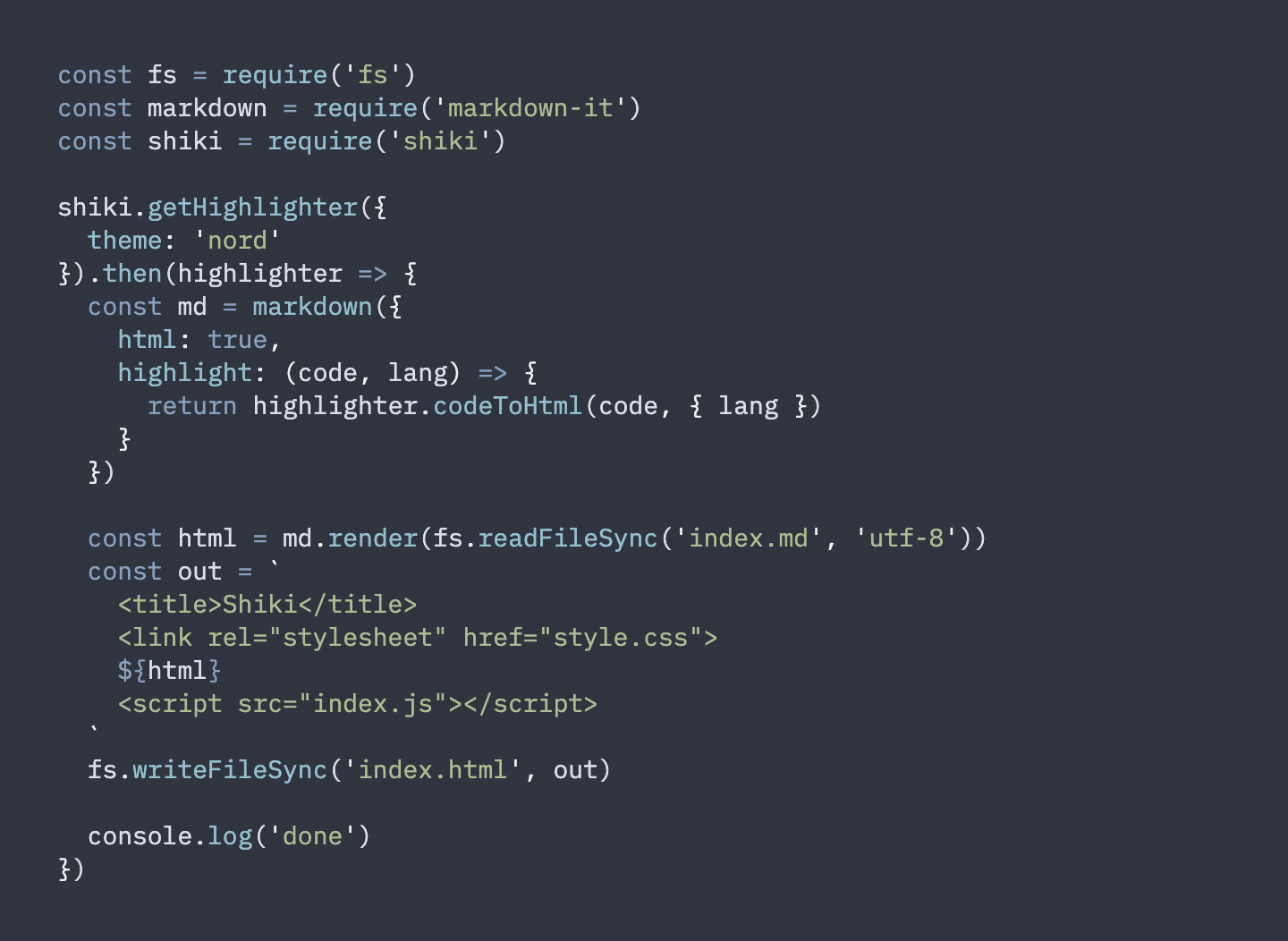 This javascript library/module uses the aforementioned TextMate grammars to tokenize strings, and colors the tokens with VS Code themes. Shiki generates HTML that looks exactly like your code in VS Code, and it works great in your static website generator (or your dynamic website). It’s daft easy to use: