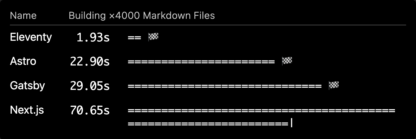 Sites built with Eleventy are “static”, just like other ones (e.g., Hugo, Quarto, Jekyll), so this is a big reason for their speed claim. They also perform incremental content builds (a feature also in other generators, like Quarto) meaning that only the files that have changed will be rebuilt. This feature significantly reduces build times, especially for large projects. Unlike many things in javascript-land, 11ty has minimal dependencies, which further helps speed up builds.