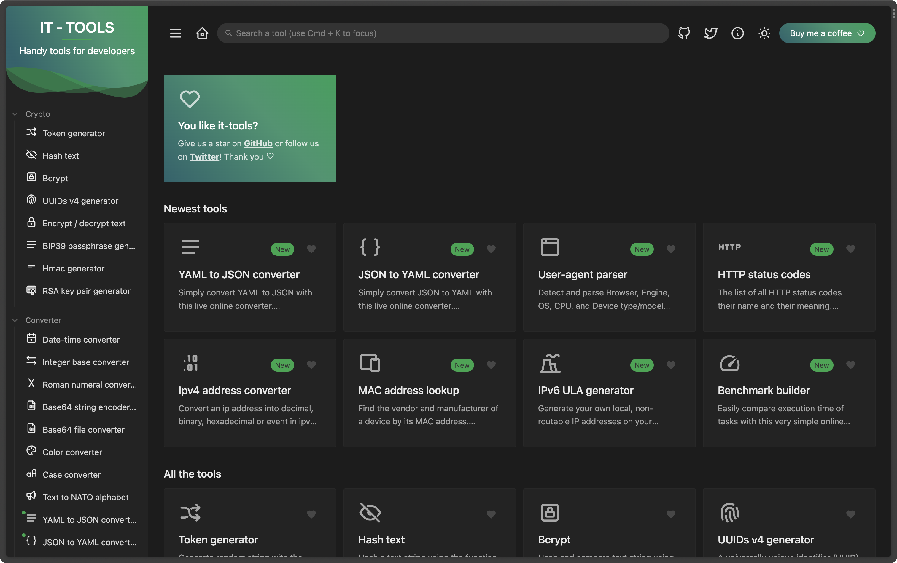 IT TOOLS (GH) is a VERY lightweight and self-hostable “tools page” for anyone who wants to transform text/html/data into something else (or glean info from it).