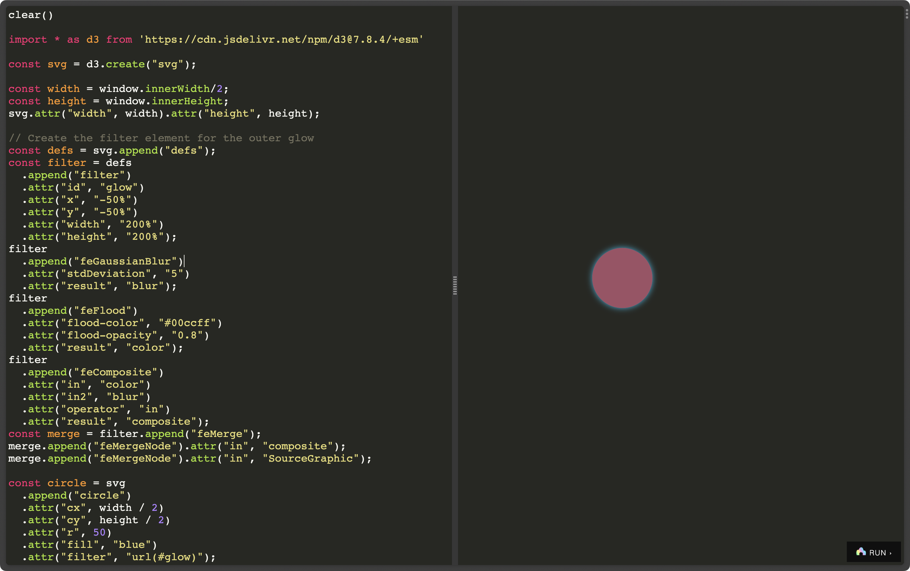resultEl // - returns result elementTo get you started, I threw together a moderately complex D3 example (below) you can paste into JSDen and then hack on. Comment stuff out! Add new code! Break things and try to fix them! Just re-paste the original code to get back to the starting point.