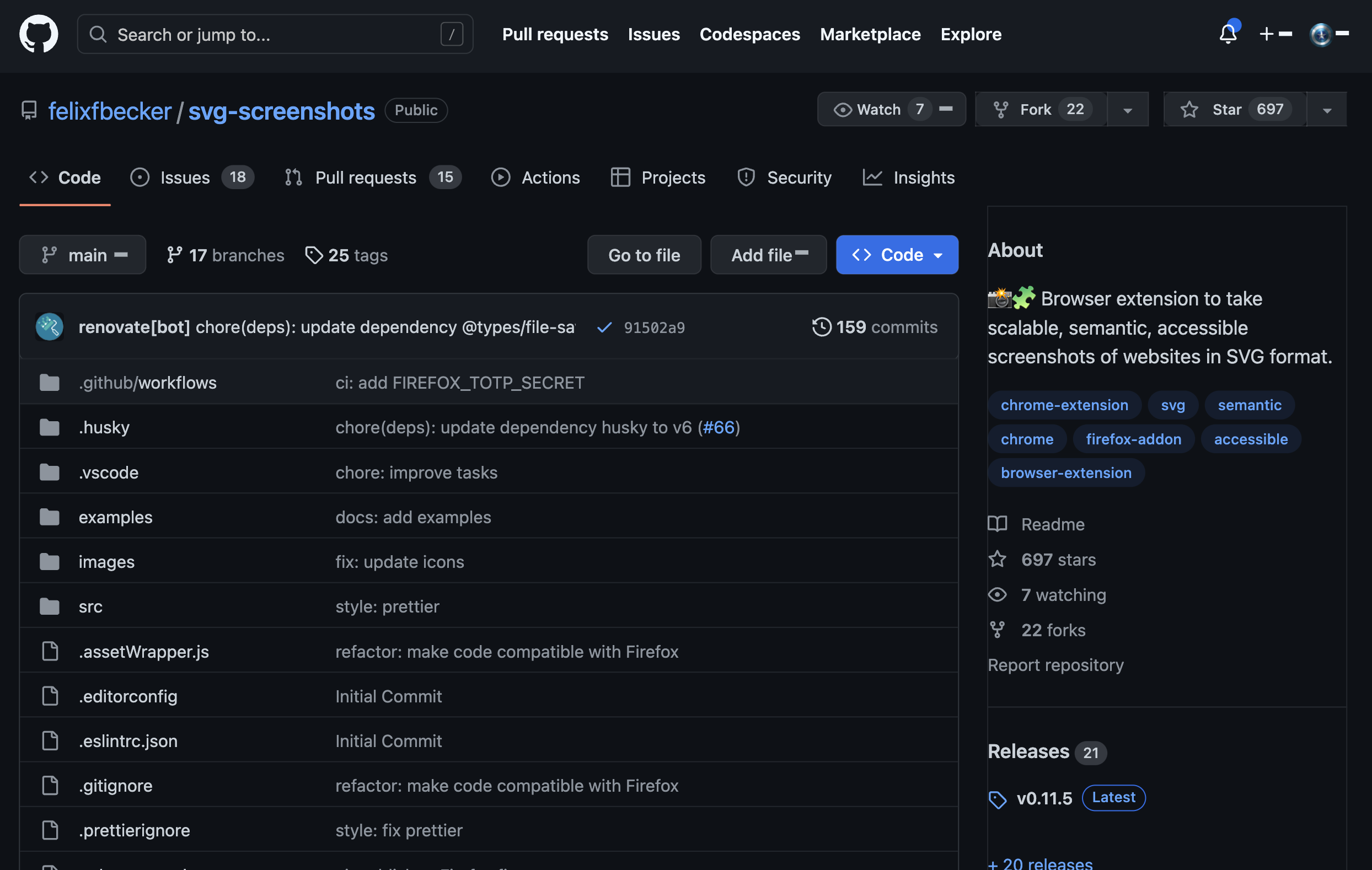 I’ve used dom-to-svg — a JS library to convert a given HTML DOM node into an accessible SVG “screenshot” — on more than a few occasions in various projects. However, I never poked around all of Felix Becker’s GH repos until a little while ago. That’s when I came across svg-screenshots a browser extension to take scalable, semantic, accessible screenshots of any website (or portion of a website) in SVG format.