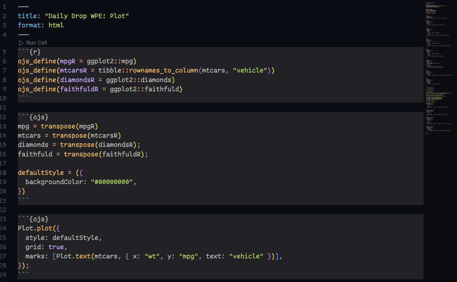 The other is that we take some data from R, but also read some other data in from CSVs. We do that because my version of Quarto doesn’t seem to have Plot.raster nor Plot.auto. That means I had to show you how to use Observable Plot the normal way (i.e., in {ojs} blocks) and the vanilla way, via regular ol’ JavaScript.