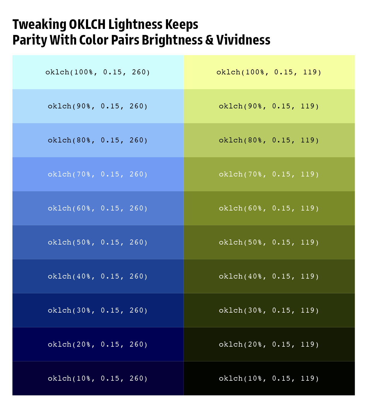 OKLCH is a “new” color notation introduced in CSS Color Module Level 4 that uses lightness, chroma, and hue values closer to how we humans perceive color. This innovative color notation offers several advantages over traditional color notations like RGB and HSL, making it an ideal choice for web designers, developers, and folks involved in data visualization. I scare quoted “new” since this notation has been around a bit, but it’s finally taking off now that virtually every browser supports it.