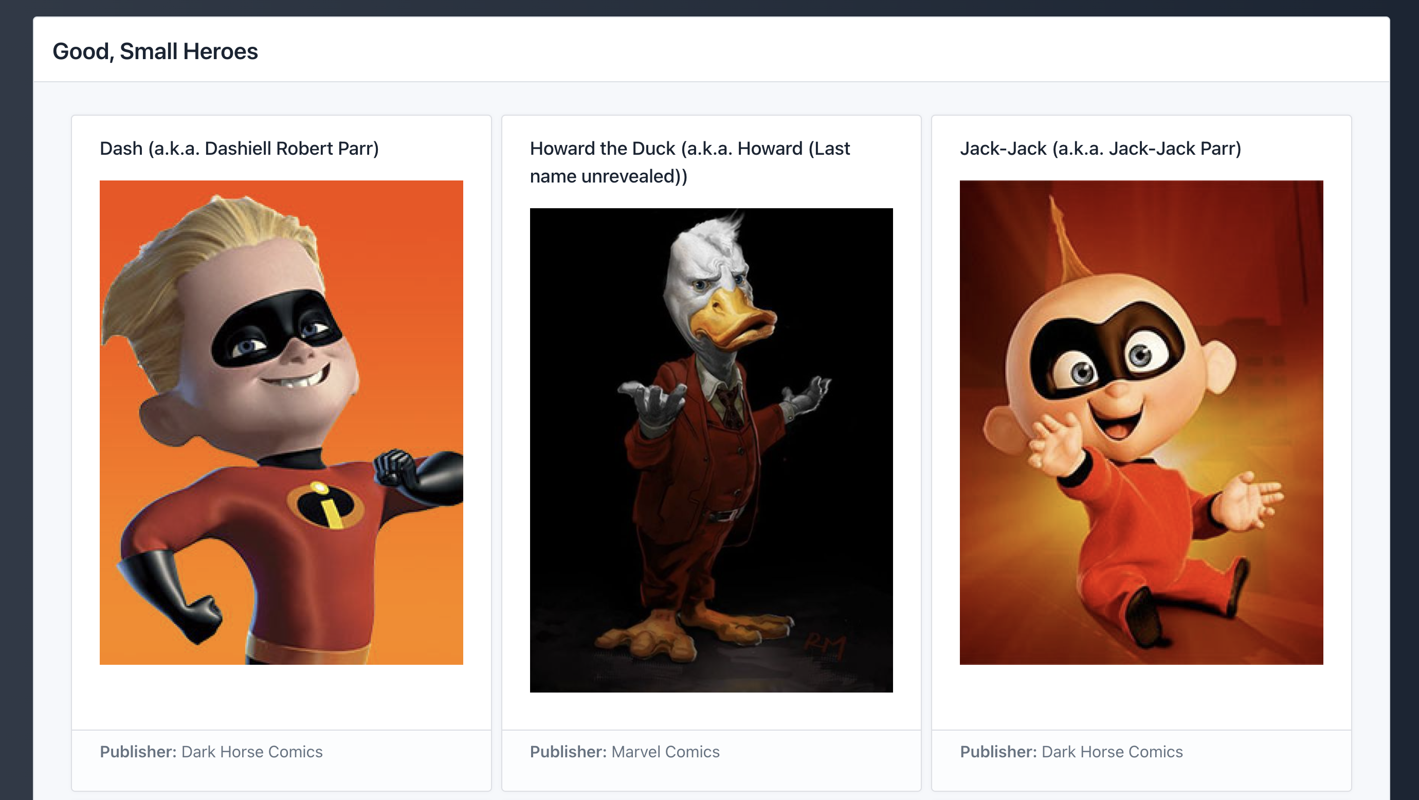 The next SELECT is operating in the context of that card container, and setting values to parameters supported by the card component will populate the grid. In this case, we’re setting a name (|| is ANSI SQL infix concatenation; this could be confusing if you’ve only ever used MySQL/MariaDB or MS SQL Server), displaying an image, and noting the publisher in the card footer.