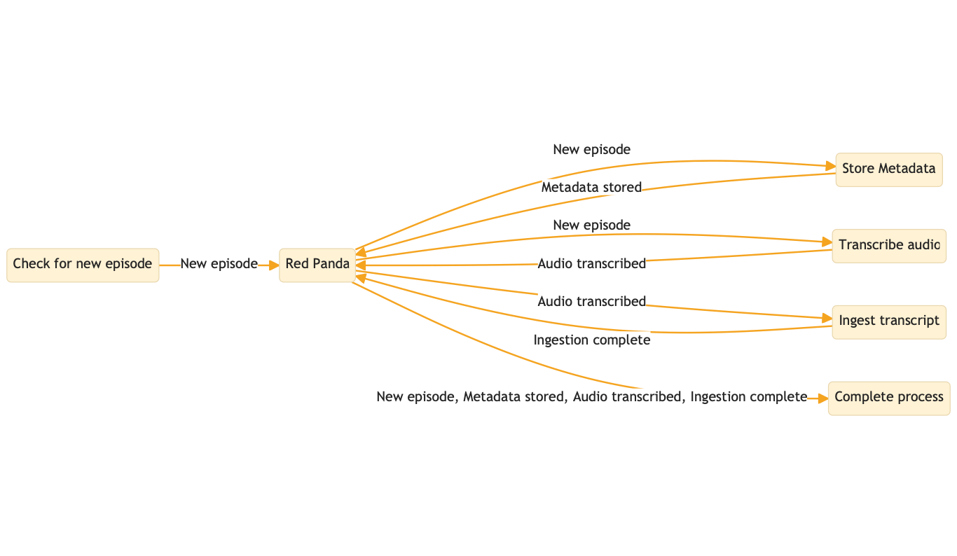 where we have a central message broker (“Red Panda”) receiving and broadcasting messages that various consumers are watching. Each consumer does one, focused process and returns success/failure events back to the broker. One of those consumers knows all the events that need to be finished before a new podcast ingestion workflow can be said is “complete” and is responsible for finalizing the entire transaction.