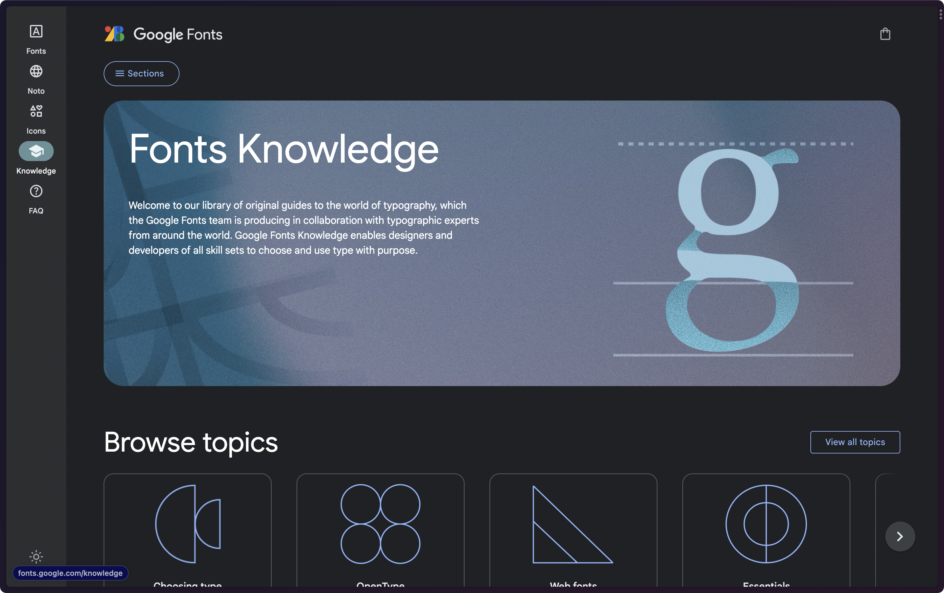 The “Knowledge” section is a resource that enables designers and developers of all skill levels and skills diversity to choose and use type with purpose. Folks can browse various topics related to typography, font selection, and best practices for using fonts in their projects.