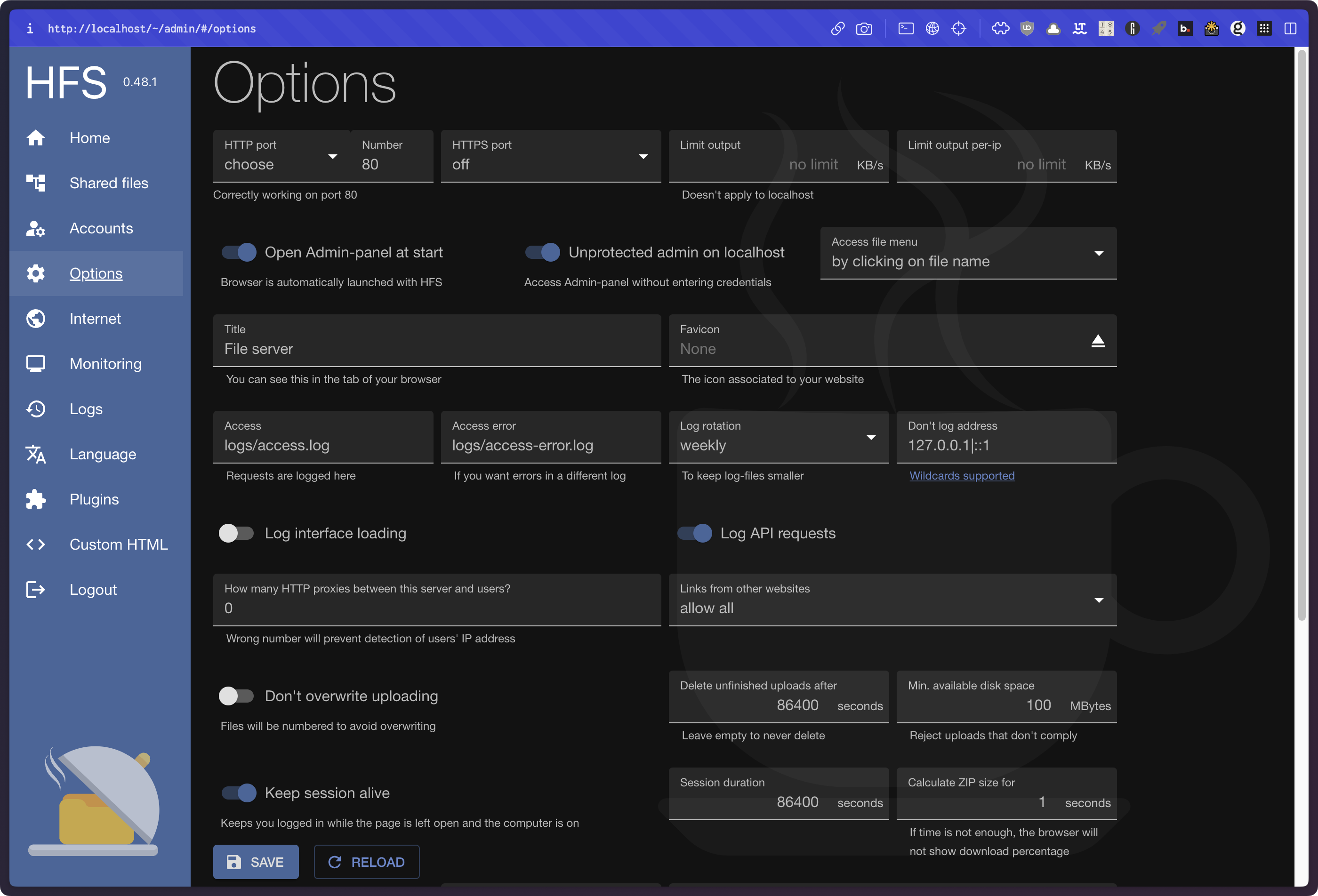 Running it is as simple as following the instruction to download the binary from the releases (run it from source — after inspecting said source — if you want to be sure what’s happening) and running hfs. You’ll get an admin screen similar to the one in the section header, and can configure everything you need to pretty quickly.