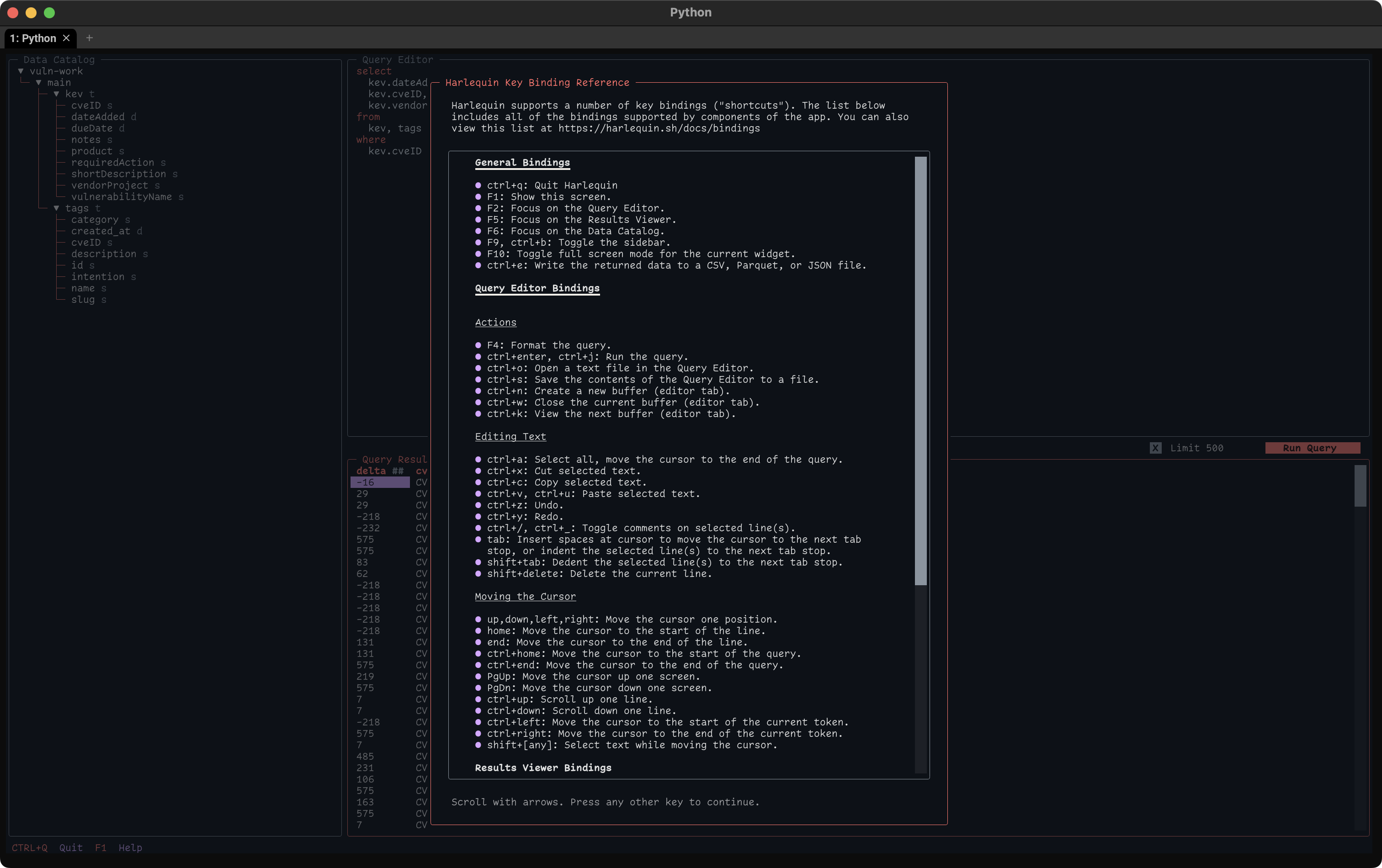 $ harlequin "md:" ~/Data/ddb/vuln-work.duckdbIt will do an auth dance, and provide information back in the terminal to show how to store the authentication token for future sessions.