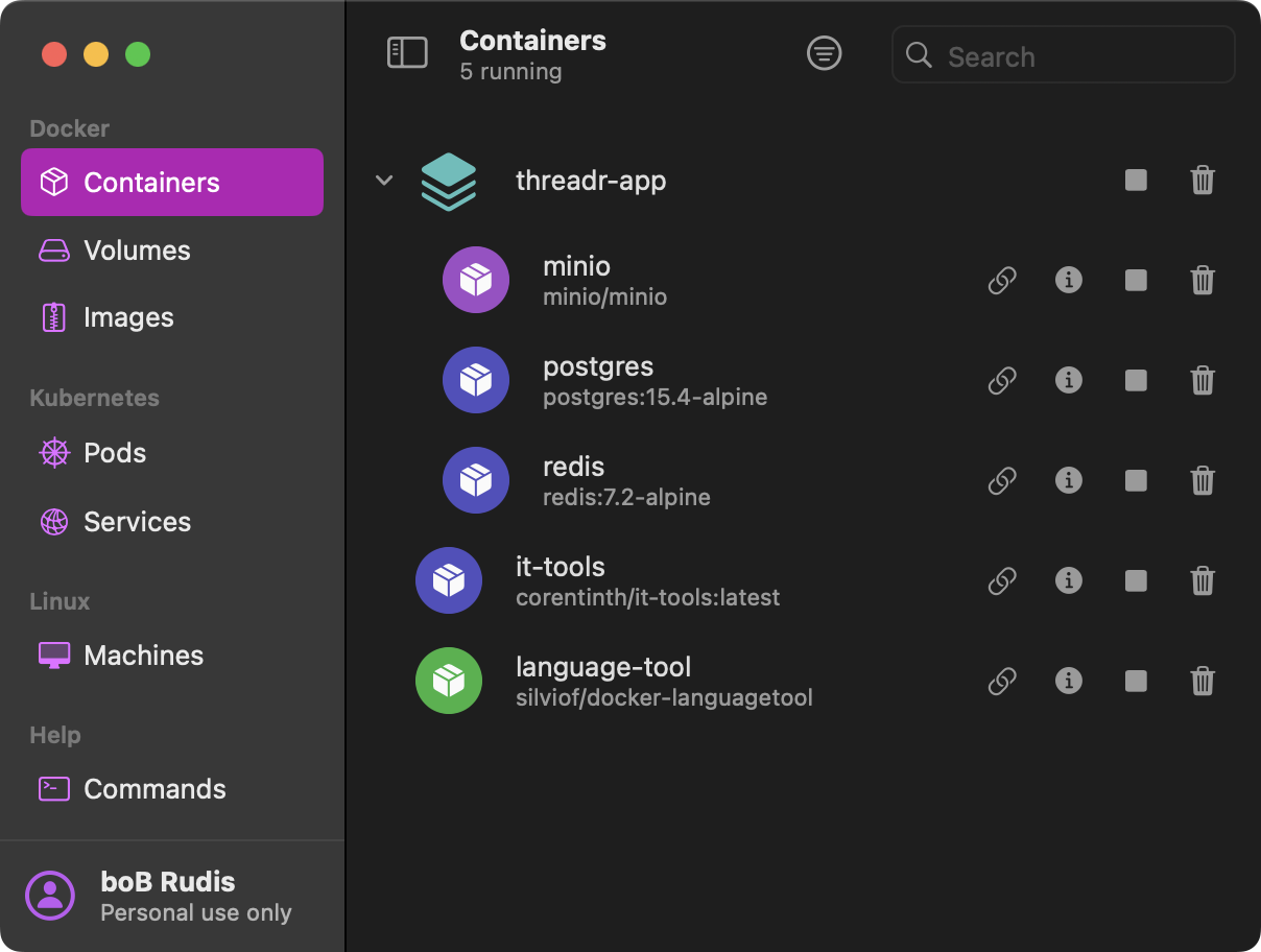 We’re only partially covering OrbStack (GH) today because I was super impressed with the UX — seen in the section header — for the docker-compose app stack UX for Threadr. I still need to do a full Knowledge Drop on it since it has enough features to warrant it.