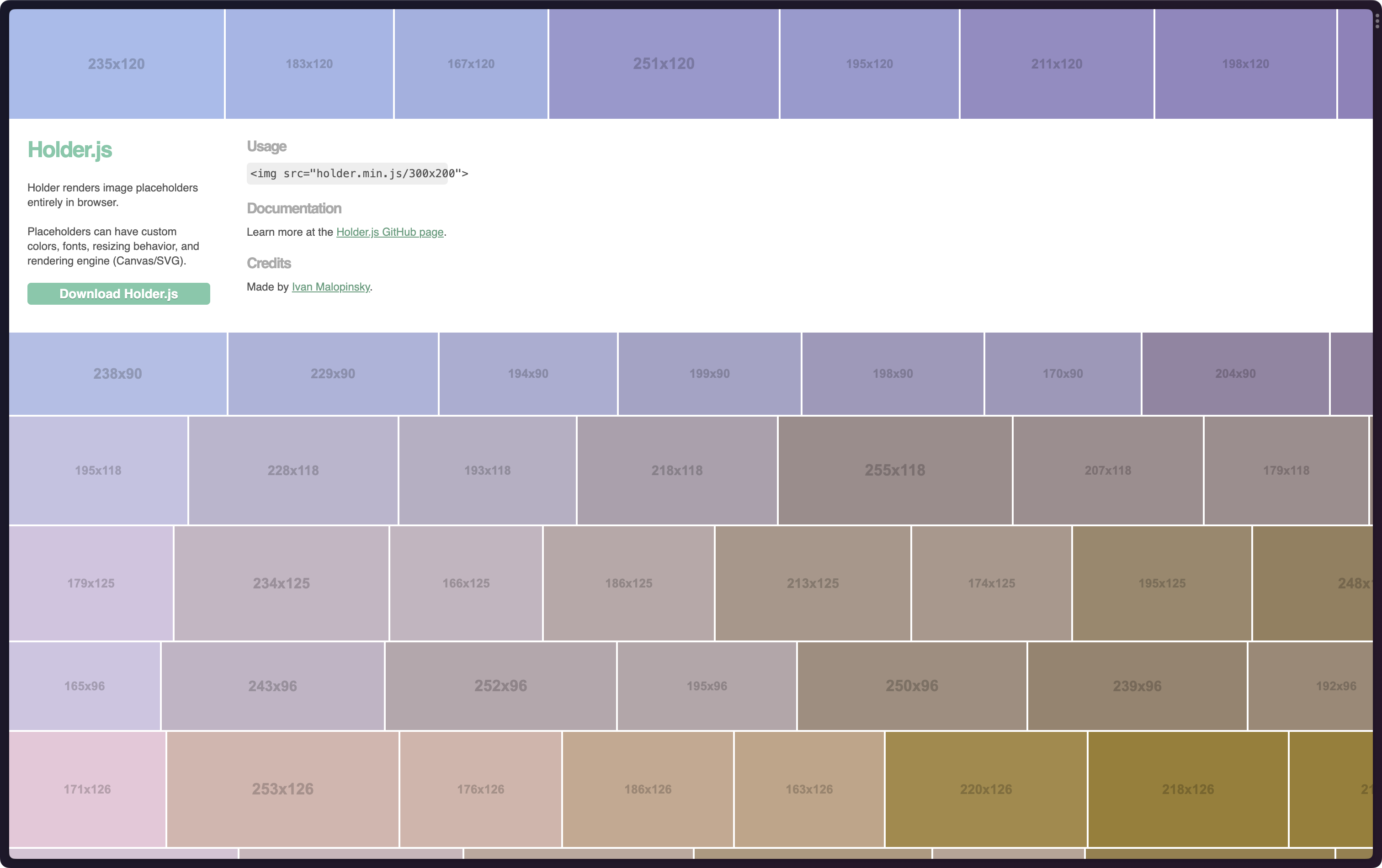 Holder.js is small JavaScript library that lets you insert rectangular SVG placeholders in <img> tags. It’s super helpful when framing out a new app or website, or using as a temporary placeholder while a large image is downloading or being rendered on the fly.
