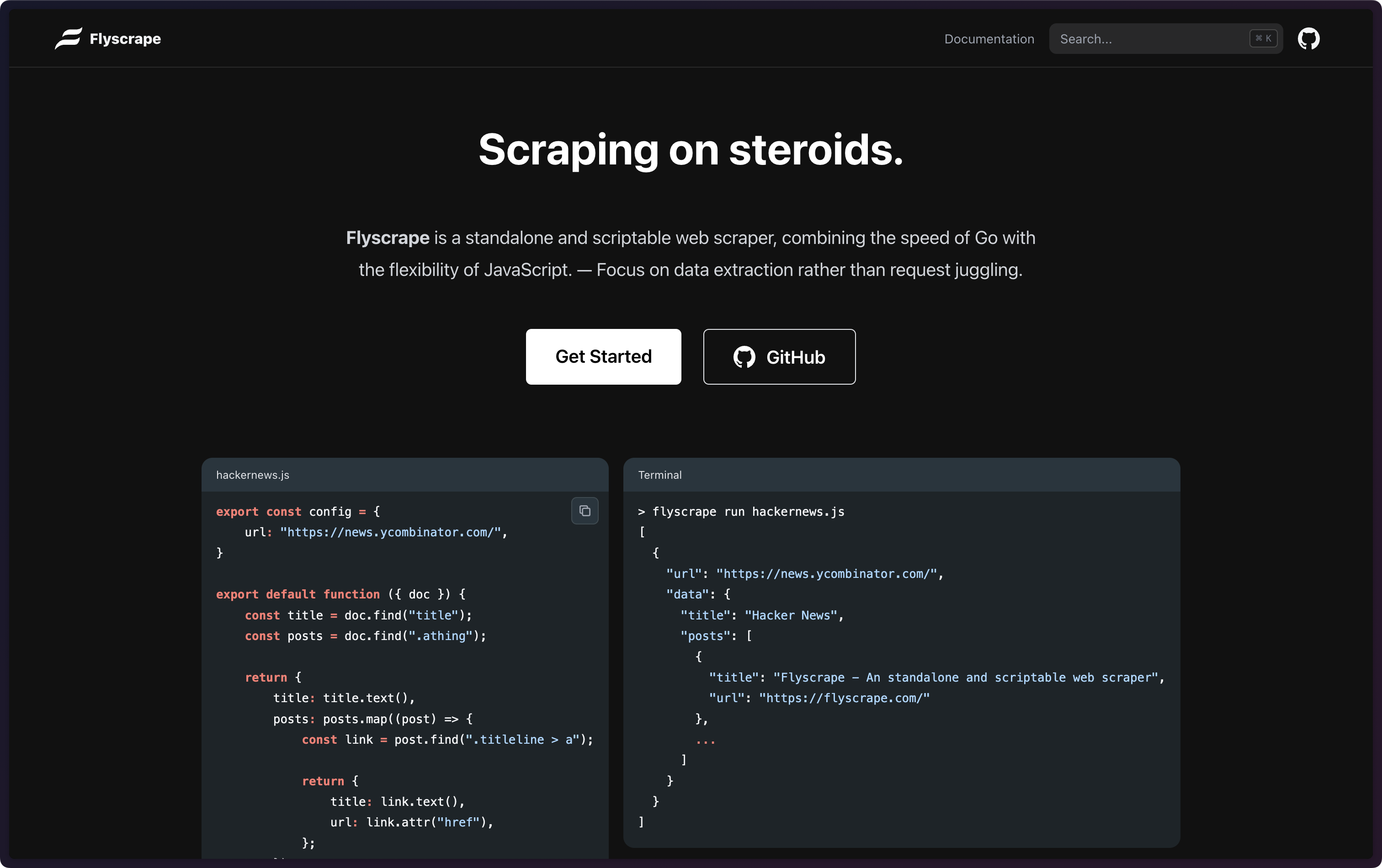 Flyscrape is written in Golang, but you use the embedded JavaScript interpreter to write the scraping configuration and processing functions. I won’t even try to show examples here as the site’s documentation, and copious README examples do the job better than I would.