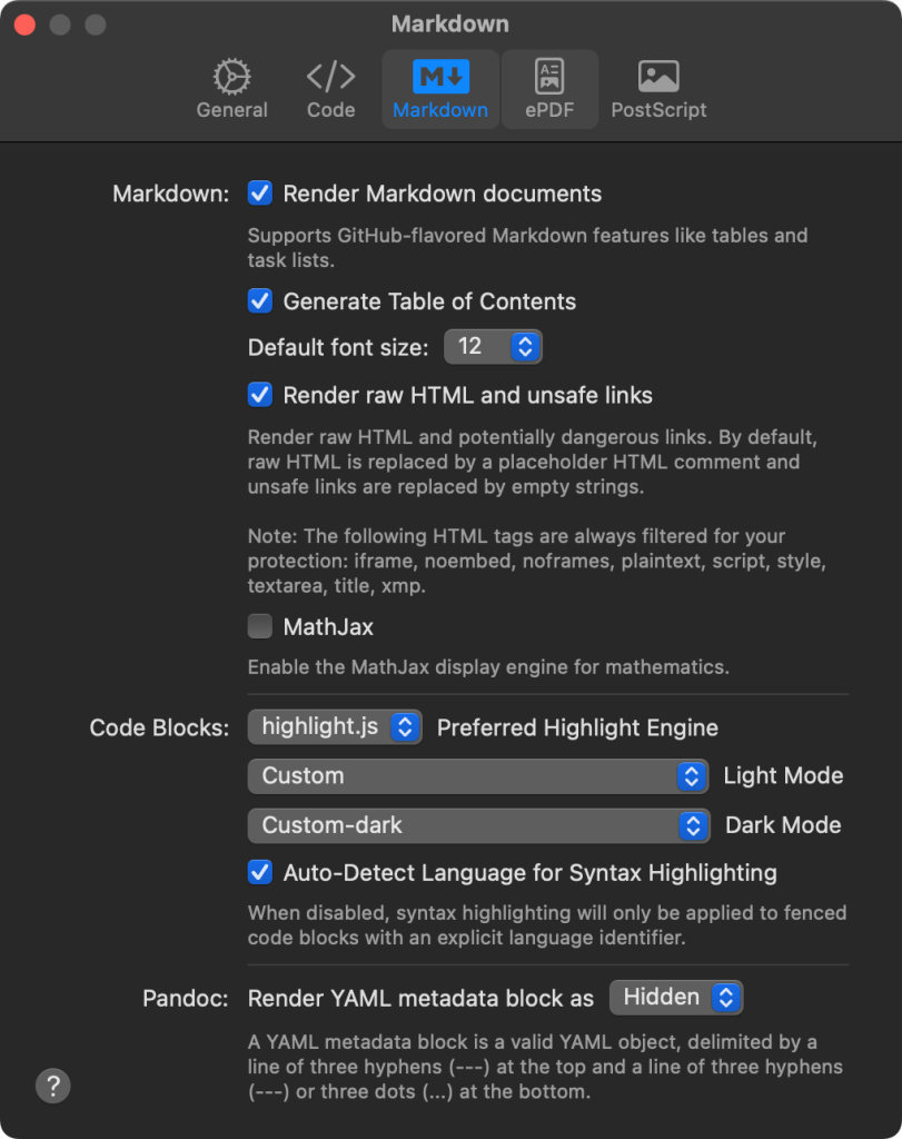 I tend to avoid QuickLook, as it is often slow and buggy. I’ll likely use it much more, now, since Peek is speedy and has some very neat features. This includes the ability to choose the font for source rendering, colourful syntax highlighting, elegant copy from the QuickLook preview window, and a crazy amount of configuration options for Markdown rendering as you’ll see below: