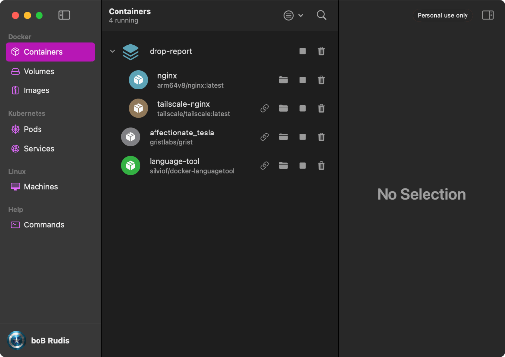Again, that’s not the recommended way to “container” dance, and all these services are local, meaning you can only access them on your Mac. We can make a more robust setup, that allows others to access the report server over Tailscale (no need to expose things needlessly to the entire LAN/internet) by using Docker Compose: