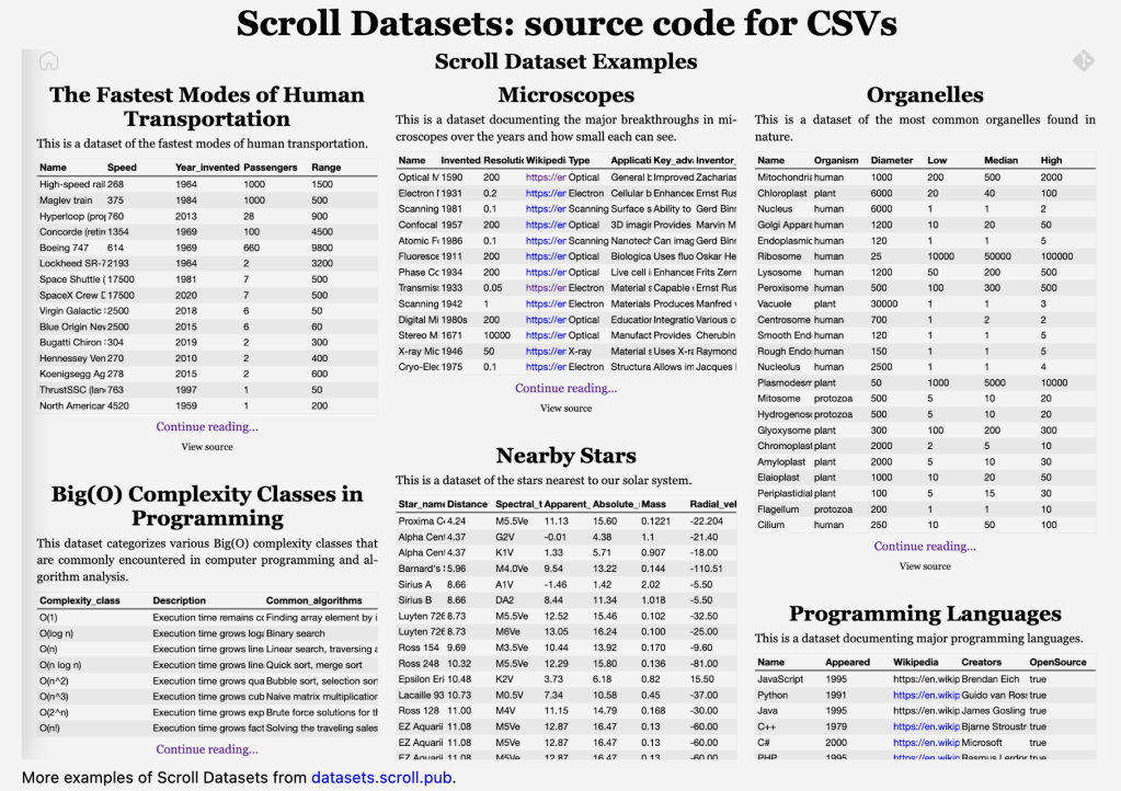 I found out about it via this new-ish blog post which lets you combine datasets into a Scroll document to make data-driven content. Sure, we we can already to with with R Markdown, Quarto, and even Typst.
