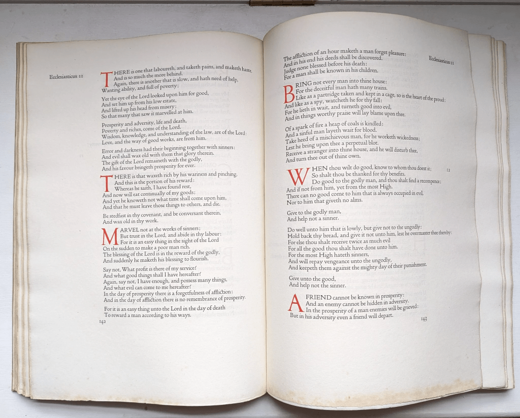 Recovering lawyer (can one ever truly recover from going down that sad occupation path?), Thomas James Cobden-Sanderson (TIL Encyclopedia Britannica is still “a thing”), had a business partner — Emery Walker. Together, in the late 1800’s, they formed Doves Press, a prestigious publishing house. Doves Press is famous for many works, including their “Doves Bible” print of the King James Bible, seen in the section header.