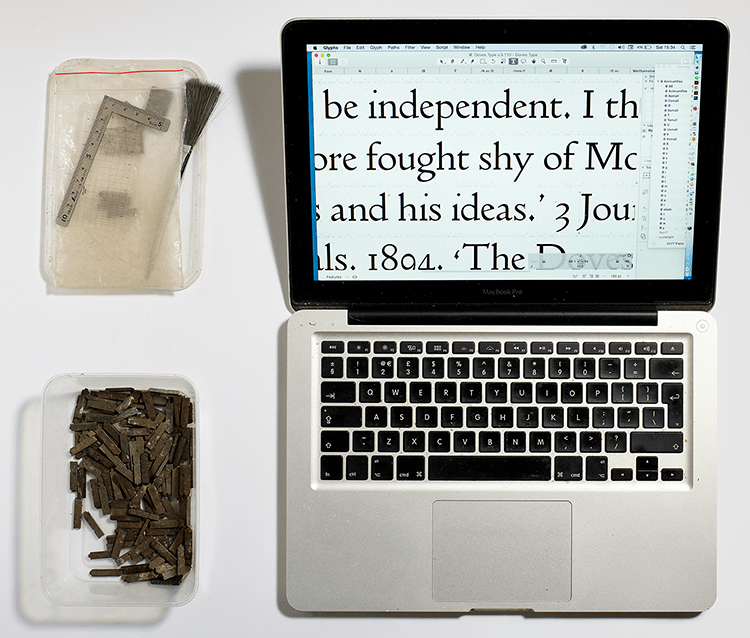 Robert Green really liked the typeface and did his best to recreate it as a digital typeface back in 2013. This involved a meticulous process of examining each printed letter and working to reproduce the individual glyphs. It worked, but Green was never truly satisfied. He dug into the lore surrounding Doves Press, and even pored over Sanderson’s journals.