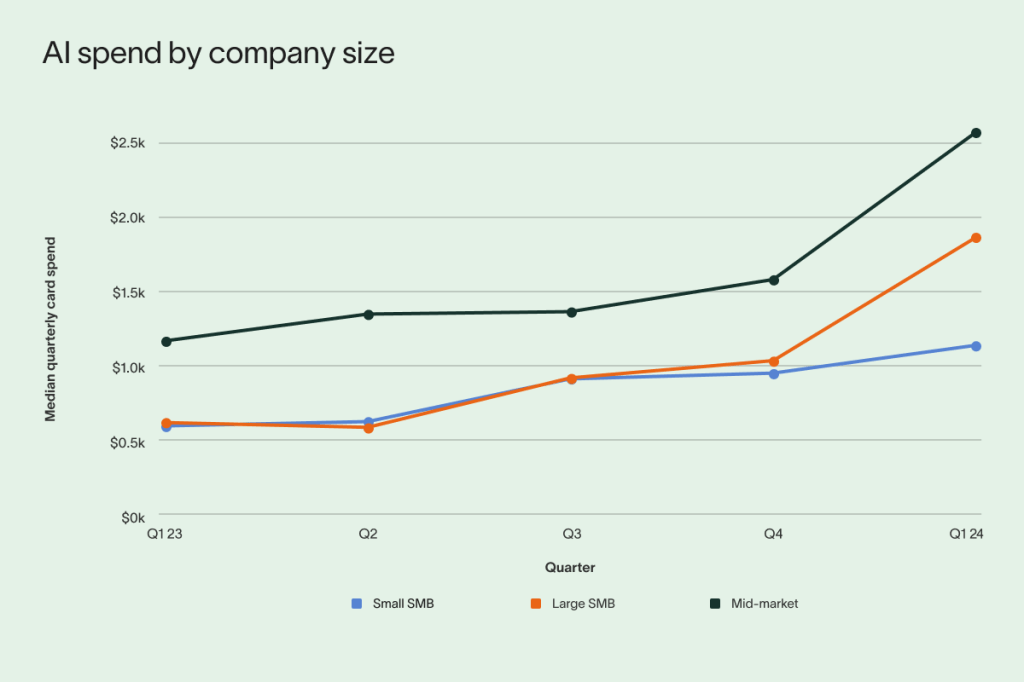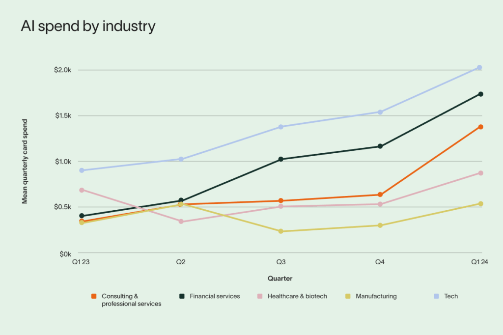 - This section discusses how companies are rapidly adopting AI tools like ChatGPT and Perplexity, with AI spending growing 293% last year according to a report from Ramp (https://ramp.com/reports/q1-2024-business-spending-benchmarks/), as businesses invest heavily in AI to drive efficiency and unlock new revenue streams.