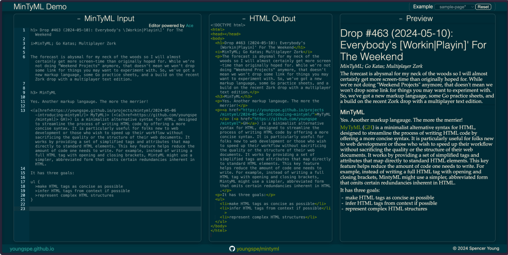 MinTyML (GH) is a minimalist alternative syntax for HTML, designed to streamline the process of writing HTML code by offering a more concise syntax. It is particularly useful for folks new to web development or those who wish to speed up their workflow without sacrificing the quality or the structure of their web documents. It works by providing a set of simplified tags and attributes that map directly to standard HTML elements. This key feature helps reduce the amount of code one needs to write. For example, instead of writing a full HTML tag with opening and closing brackets, MintyML might use a simpler, abbreviated form that omits certain redundancies inherent in HTML.