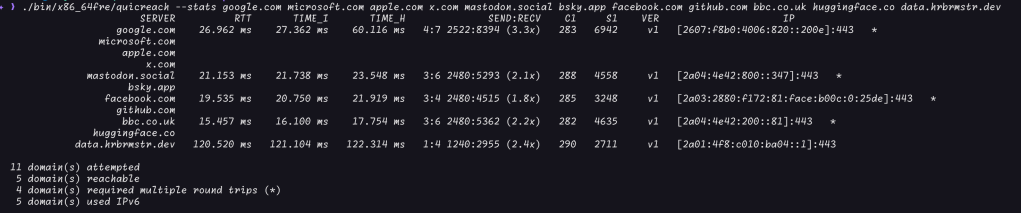 While you can compile curl with support for HTTP/3 to reach out and touch a QUIC-enabled site, Microsoft has released source for a CLI tool — quicreach – that can be used as a sort of “QUIC ping” utility that lets you test the QUIC reachability of one or more target sites.