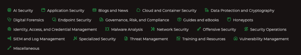 Billed as “the largest curated directory of cybersecurity tools and resources”, CyberSecTools does a fairly good job executing on that promise (despite not listing my org’s service/tool). It has nearly 2,400 tools across the following categories: