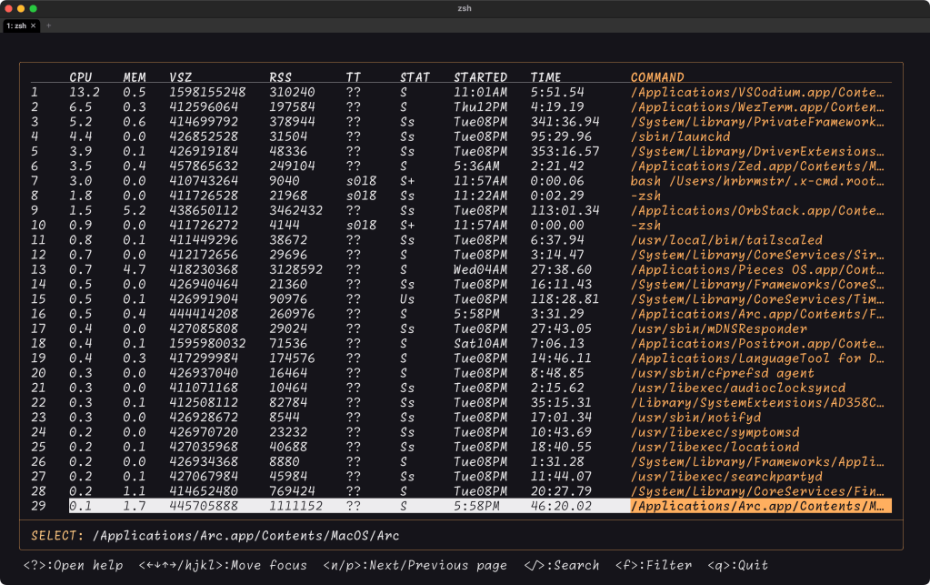 X-CMD provides a nice TUI layer on top of tools like ls, ps, and more. The ps output is in the section header. A super nice feature of the enhanced commands is that you can pipe them to one of the supported models and start a chat: