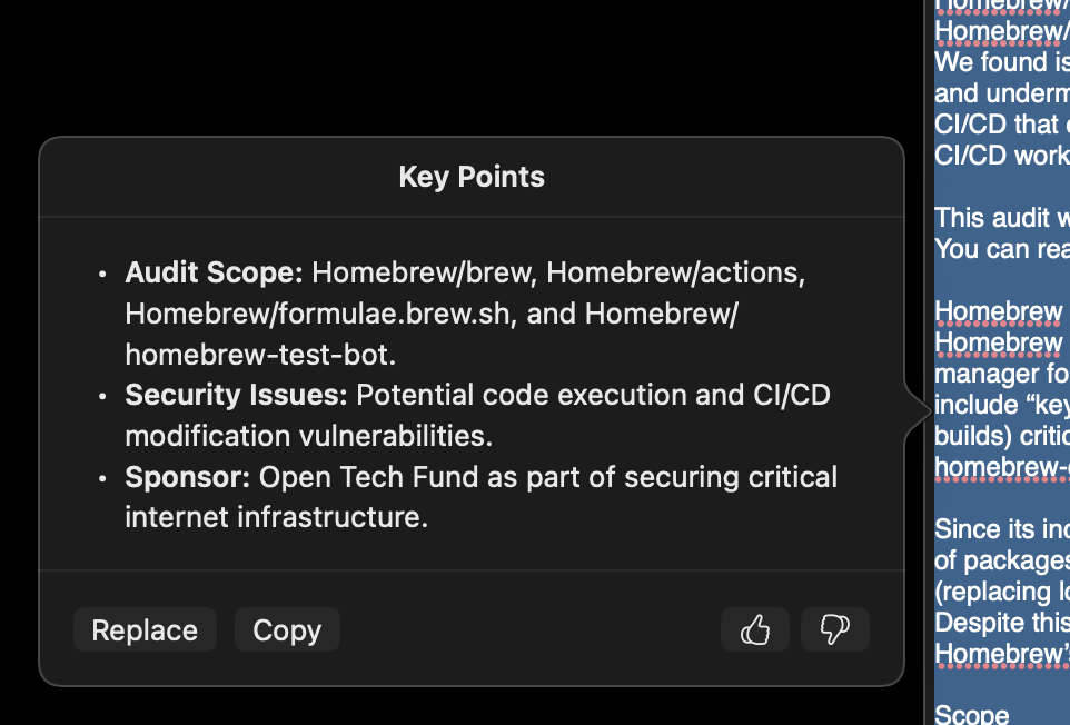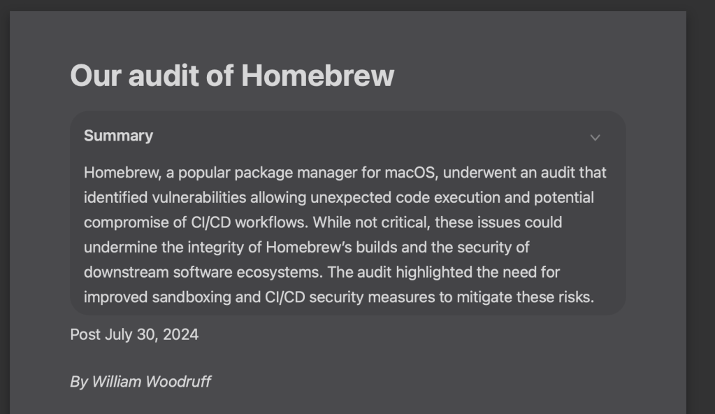 For Homebrew users and developers, this audit serves as a reminder of the ongoing security challenges in maintaining widely-used open-source tools. Read the whole report, and make sure to keep an eye out for updates from the Homebrew team addressing these findings.