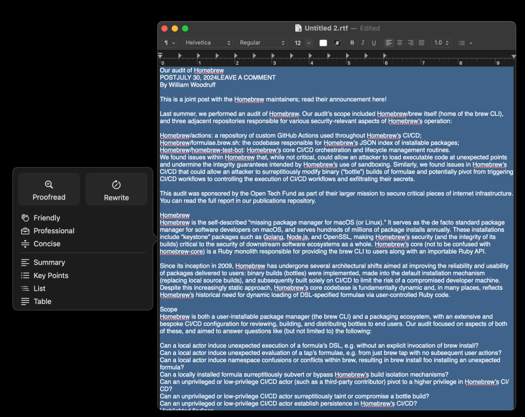 Writing Tools can also be put into a temporary popover toolbar for the same operations: