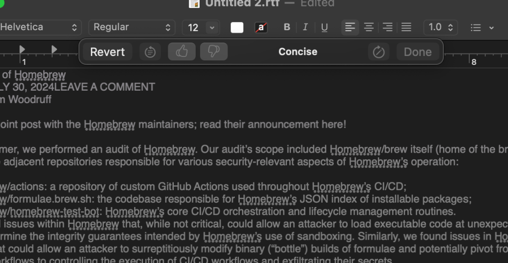 While it would have worked from the web page-proper, I pasted the text from the ToB Homebrew blog for some examples. This is the main sub-pane that pops up when you ask it to display writing tools (it’s a context menu item as well as a main menu bare item in many text-centric contexts across the OS).