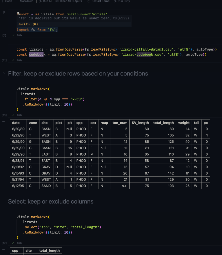 Lynn of TITAA fame (the most recent issue is up, and if you do no subscribe you’re missing out!) re-posted (on 🦋) a HackerNews bot post about a new TS/JS notebook system named Vitale (GH). That piqued my interest, so I checked it out, and thought I’d drop my first impressions in the weekend Drop.