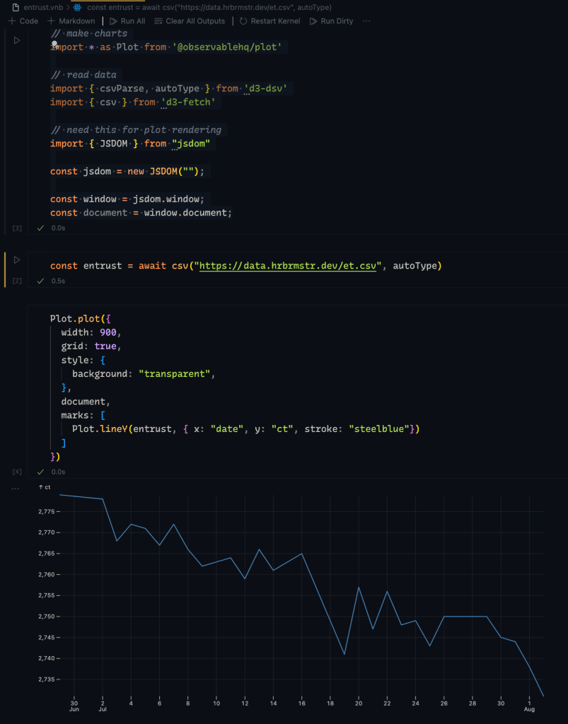 That pnpm is the “performant node package manager”. It’s faster and more disk-efficient, and the Vitale examples all use it, so we will too. We’re bringing D3 helpers and both jsdom and Observable Plot to the party, and all we’re going to do is visualize a remote CSV (that counts as one of those moldable things, though, since it’s task-specific).