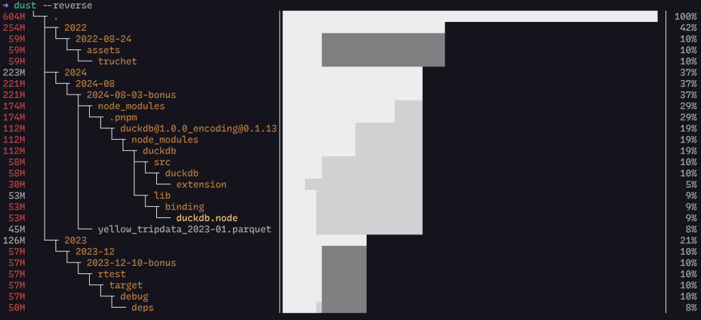 - dust: A ‘du’ alternative with a half-CLI, half-TUI interface that provides a visual representation of disk usage, automatically identifying the largest space consumers. [https://github.com/bootandy/dust]