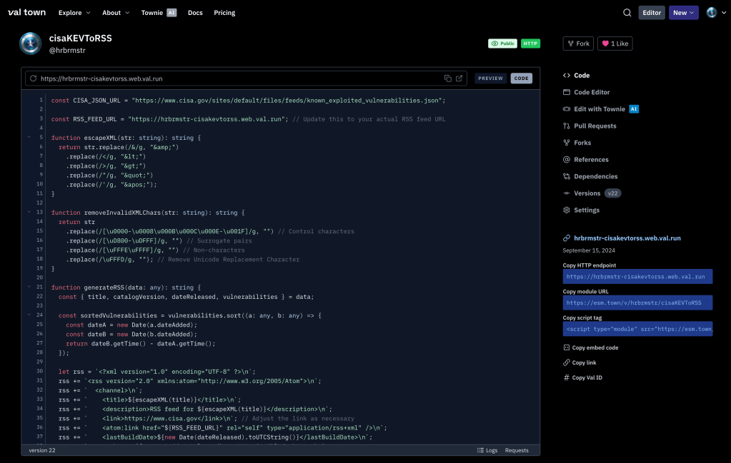 This time, the code (https://www.val.town/v/hrbrmstr/cisaKEVToRSS) has some helper functions along with the required exported one: