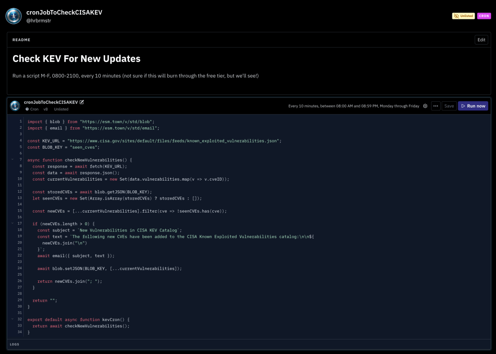 If you just want to poke at it without reading the short blathering (below), head to https://www.val.town/v/hrbrmstr/cronJobToCheckCISAKEV and fork the project.