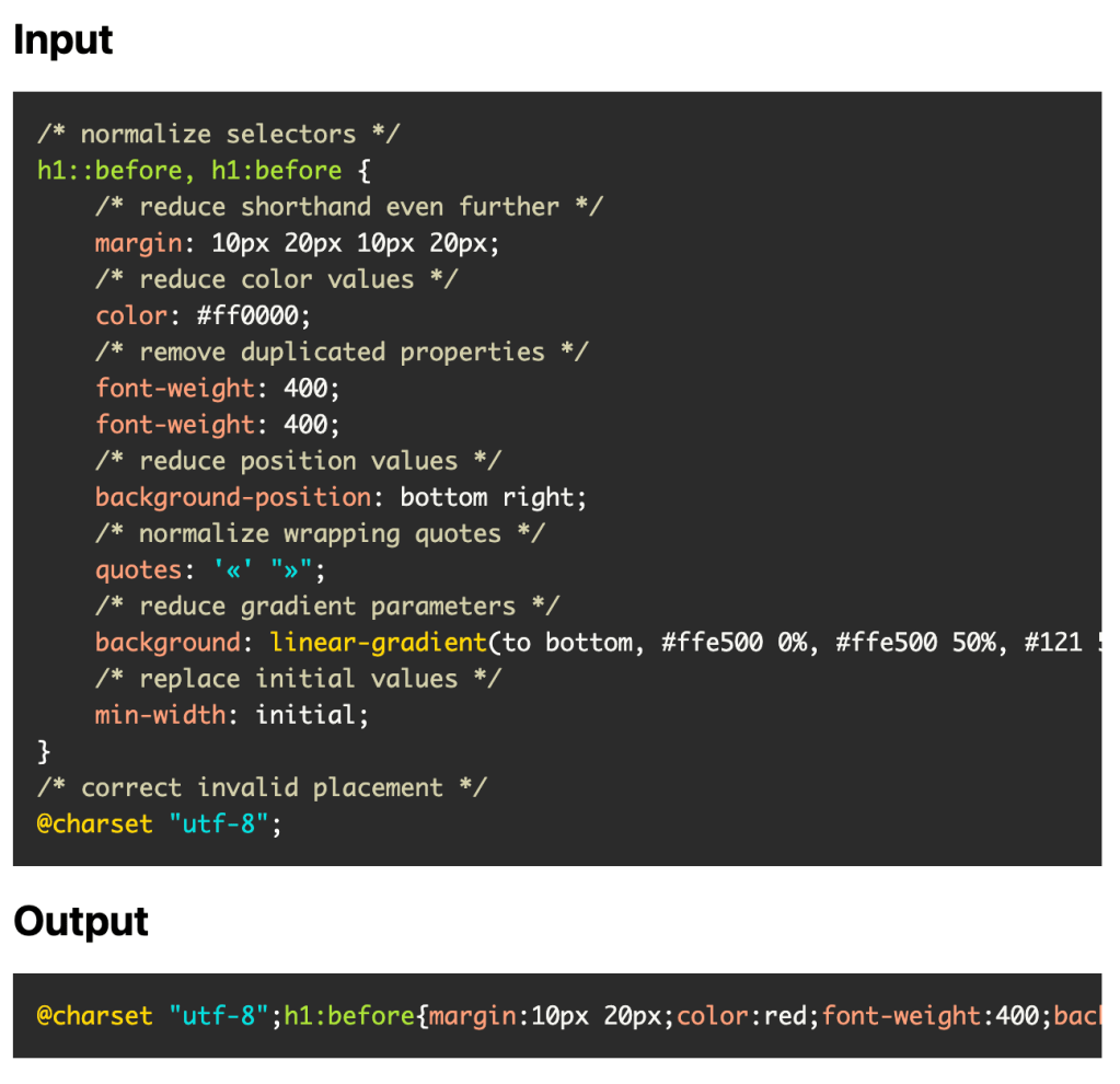 cssnano (GH) is a CSS optimization tool designed to minify and compress CSS files for production environments. It takes well-formatted CSS and applies various optimizations to produce a compact version suitable for production use. It performs a series of focused transformations to minimize file size while maintaining the original CSS semantics. There are over 30 plugins dedicated to different aspects of CSS optimization, which you have complete control over.