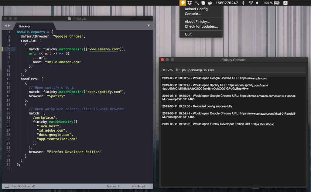 Thankfully, Finicky enables granular control over which browser opens specific links or URLs. You just set up rules in a JavaScript-config that determine which browser or app opens particular URLs. It also offers URL rewriting, letting us modify links before they’re opened (if you noticed the dev[.]to rewrite hack in the first section, that’s now a Finicky rule for me to avoid that site’s skeezy practices).