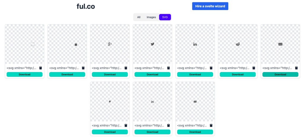ful.co is a single-task service where you prepend its URL — https://ful.co/ — to any other URL, and it will find and extract any [inline] SVG element on that page. In practice, it will identify all images, which include inline SVG. Essentially, it removes the tedium of having to copy the inline SVG elements manually from Developer Tools or view-source:.