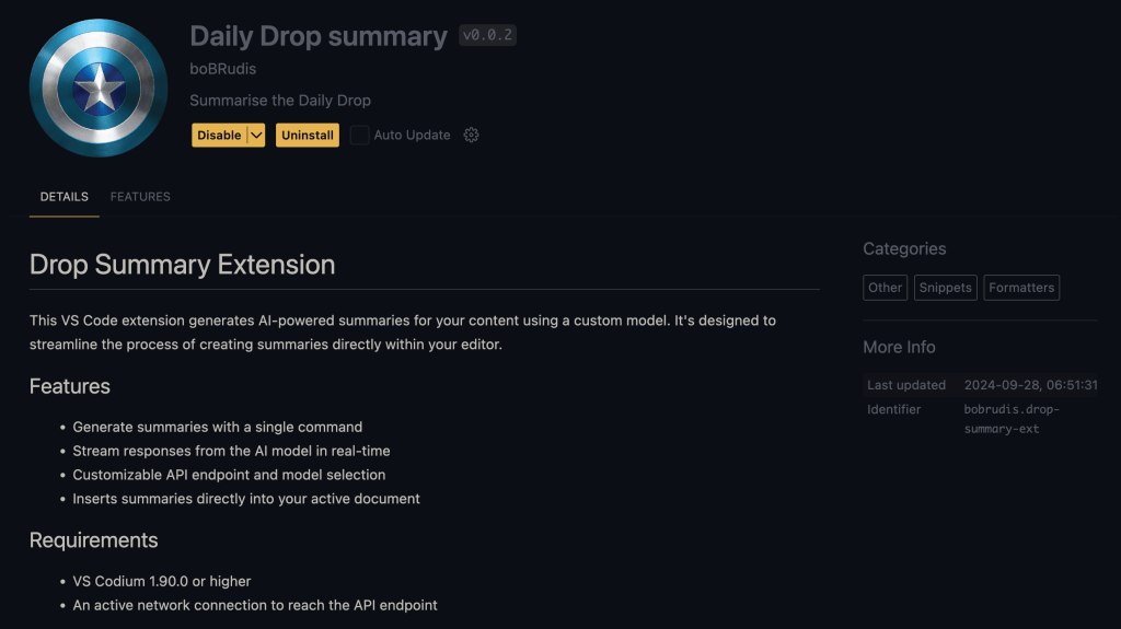 descriptionandiconalso show up in the plugin details pane. enginesspecifies the minimum viable VS Code components required to use the pluginkeywordsandcategoriesare more for when your plugin is in the Marketplace, but their presence also ensures those fields are filled out in the plugin paneactivationEventstells VS Codium what should activate which elements in the plugin. In this case,"onCommand:extension.processAndInserttells VS Codium that when theextension.processAndInsert(which has the display name ofDrop Summary) is selected from the Command Palette, it should run that bit of code. We only have one command in this plugin.contributesis a special field with an extensive configuration tree that tells VS Codium about any settings your plugin needs and what components are in your plugin. It’s pretty self-explanatory if you poke at that section in this plugin.
