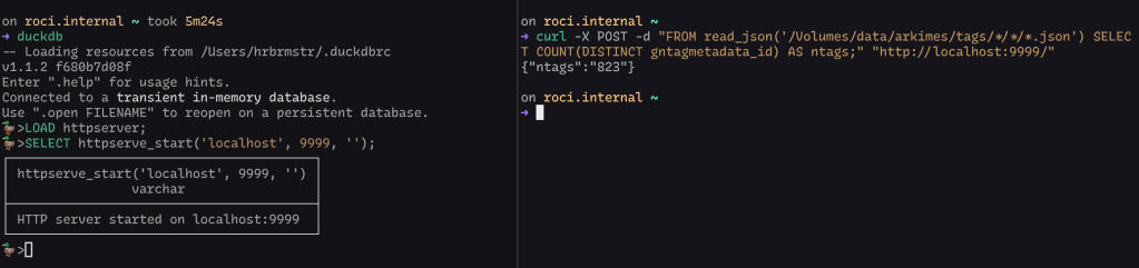 Try not to expose this to the internets or your work LAN, since DuckDB has some powerful extensions that do things like let your queries shell out to the operating system and make HTTP-based requests to your internal network resources. Also make sure to setup creds or a shared secret to help ensure only those who need access have access.