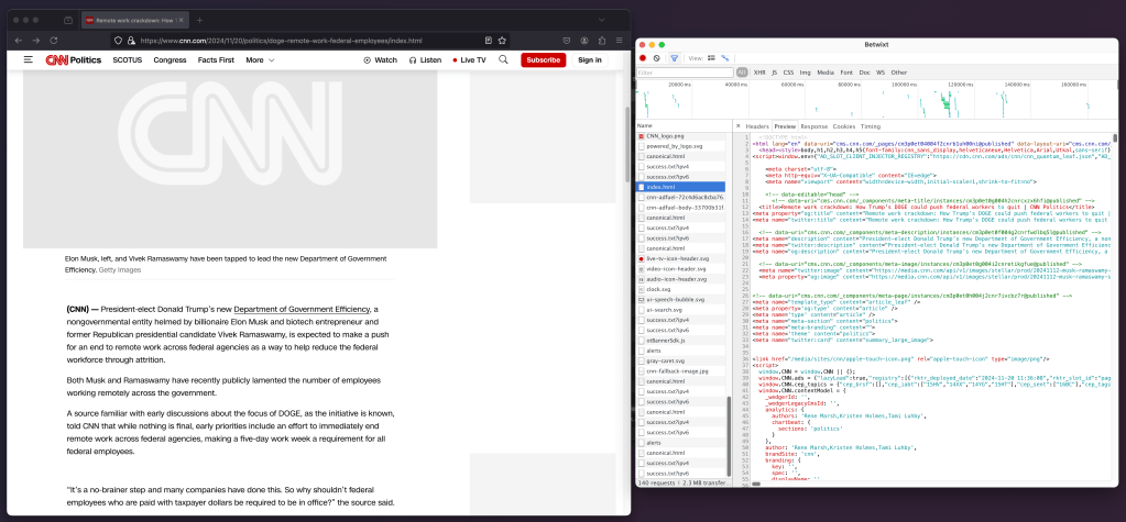 In the “I can’t believe this still works in 2024” bucket is Betwixt, a web debugging proxy that enables web traffic analysis outside the browser through a familiar Chrome DevTools interface. It operates by creating a background proxy service that listens on http://localhost:8008.