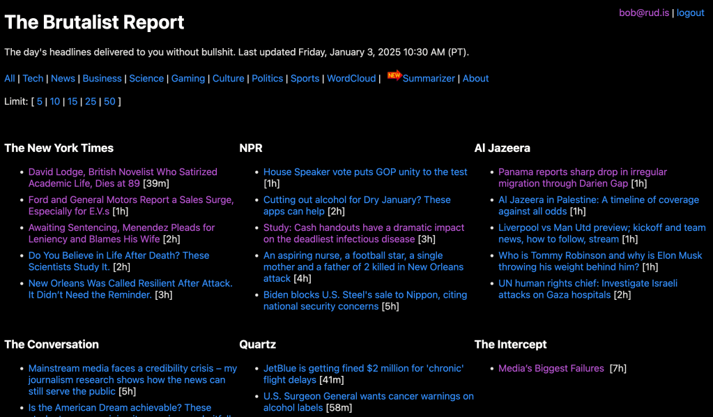 A new one popped up on my radar right at the tail end of the year: The Brutalist Report, which tags itself as “The day’s headlines delivered to you without bull💩.”