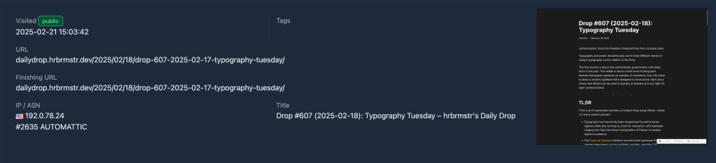 Here’s the report for this week’s Tidy Tuesday Drop — https://urlquery.net/report/a48e56e6-0dc7-439c-ad12-49eb0578da52 — so you can see what you get.