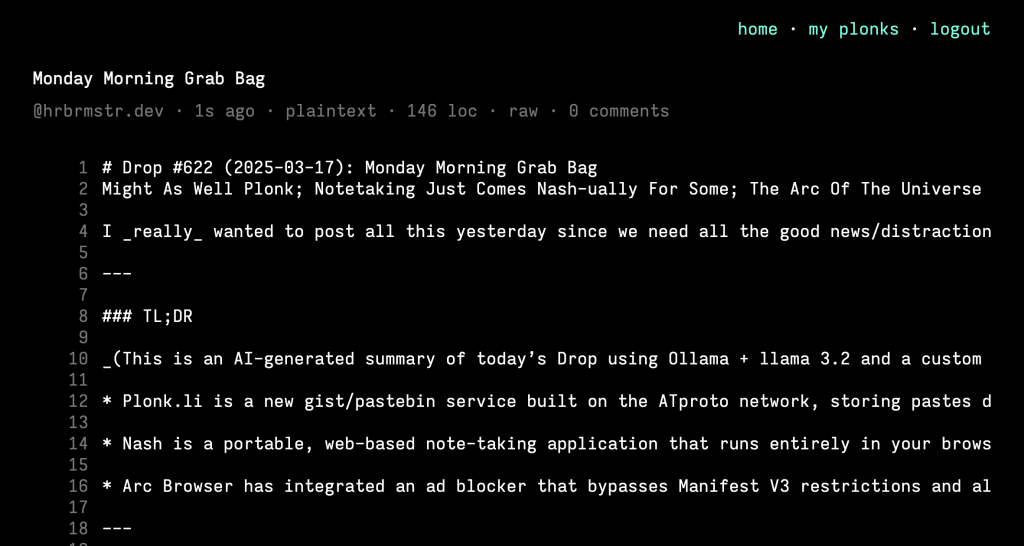 The folks that brought us Tangled are back with Plonk.li (knot) — a gist/pastebin service built on the ATproto network, the same protocol that powers Bluesky. Unlike traditional pastebins that store content on their own servers, Plonk leverages the distributed nature of ATProto by storing pastes directly in a Personal Data Server (PDS). By default, it uses Bluesky’s PDS.