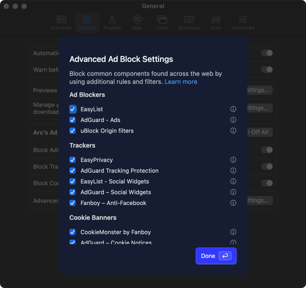 Google’s Manifest V3 update severely limits extension capabilities, particularly for ad blocking. Arc’s integrated ad blocker bypasses these restrictions, aiming for a “cleaner internet” with fewer ads and distractions. It appears to just be using the same lists that uBlock Origin uses: