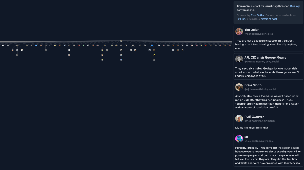 Treeverse (GH) is a web app designed to visualize conversation threads on Bluesky as tree structures, offering a spatial representation of discussions that might otherwise be difficult to follow in traditional linear formats. Developed by Paul Butler, this tool evolved from its previous incarnation that served Twitter users from 2014 to 2023, before API changes rendered that version obsolete.