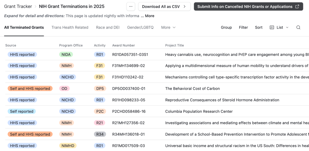 A friend of the Drop and all around IRL superhero clued me into a project they are helping maintain (not mentioning the name/handle since I did not get permission, and am not willing to put anyone in harm’s way) a tracker of NIH grant terminations for use by the community, courts, and correspondents.