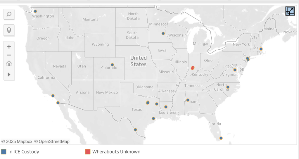 In response to these troubling developments, individuals like (Crip Dyke (@cripdyke.bsky.social) and Danielle Harlow (@danielleharlow.bsky.social) have created resources to track and document these disappearances. The USA Disappeared Tracker and its corresponding interactive map project are monitoring persons politically arrested, detained, or disappeared by the Trump administration since March 9, 2025.