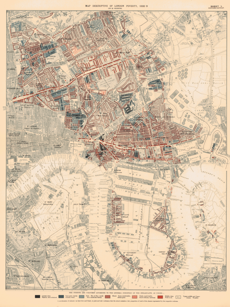 The most visually striking products of Booth’s inquiry were his poverty maps of London, color-coded street by street to indicate levels of wealth and poverty. These weren’t just any maps — they represented the first systematic, data-driven visualization of social conditions in a major city.